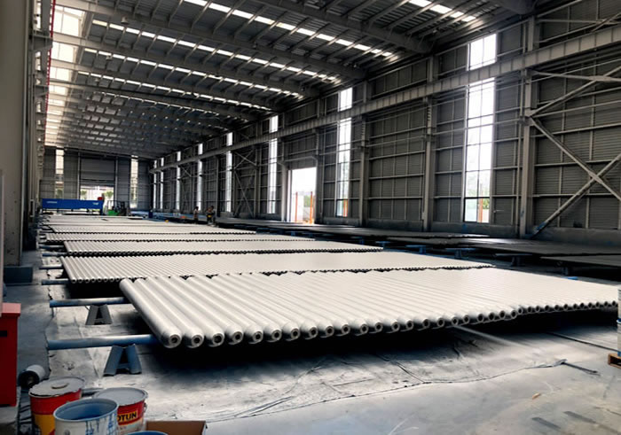 網架加工成型后對焊縫質量應進行超聲波探傷檢驗,如有不合格產品應立即進行返工。網架經過檢驗校正后采取拋丸除銹方法對鋼構件表面進行處理,根據工程需要進行涂...